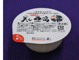 井村屋株式会社と協同開発した商品です。三重県内で契約栽培された「大豆」と長崎県五島灘の「にがり」で作った豆腐です。内容量は「75g」にし、1人1個ずつ配膳できるようにしました。豆乳濃度(大豆固形分)も12%と濃い豆乳を使い、濃厚な味に仕上げました。そのまま食べても温めて食べても、とてもおいしい豆腐です。更に「マジックトップ」と言う独自の容器を使用しており、低学年児童でも力を入れないで簡単に開けることが出来ます。 |